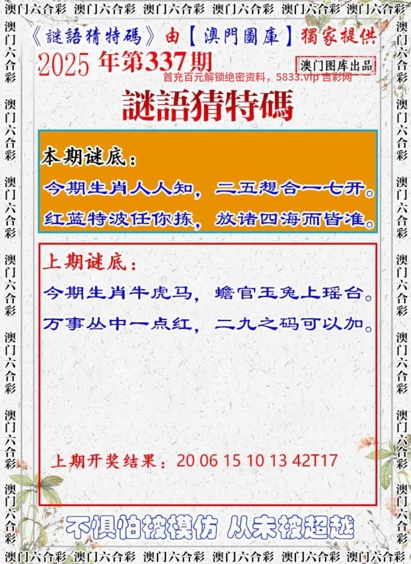 339期:【謎語猜特碼】 风调雨顺报喜事,日和风利大地春。 二三组合有玄机,三四组合有财气。 七肖:兔猴羊狗马鸡虎 |